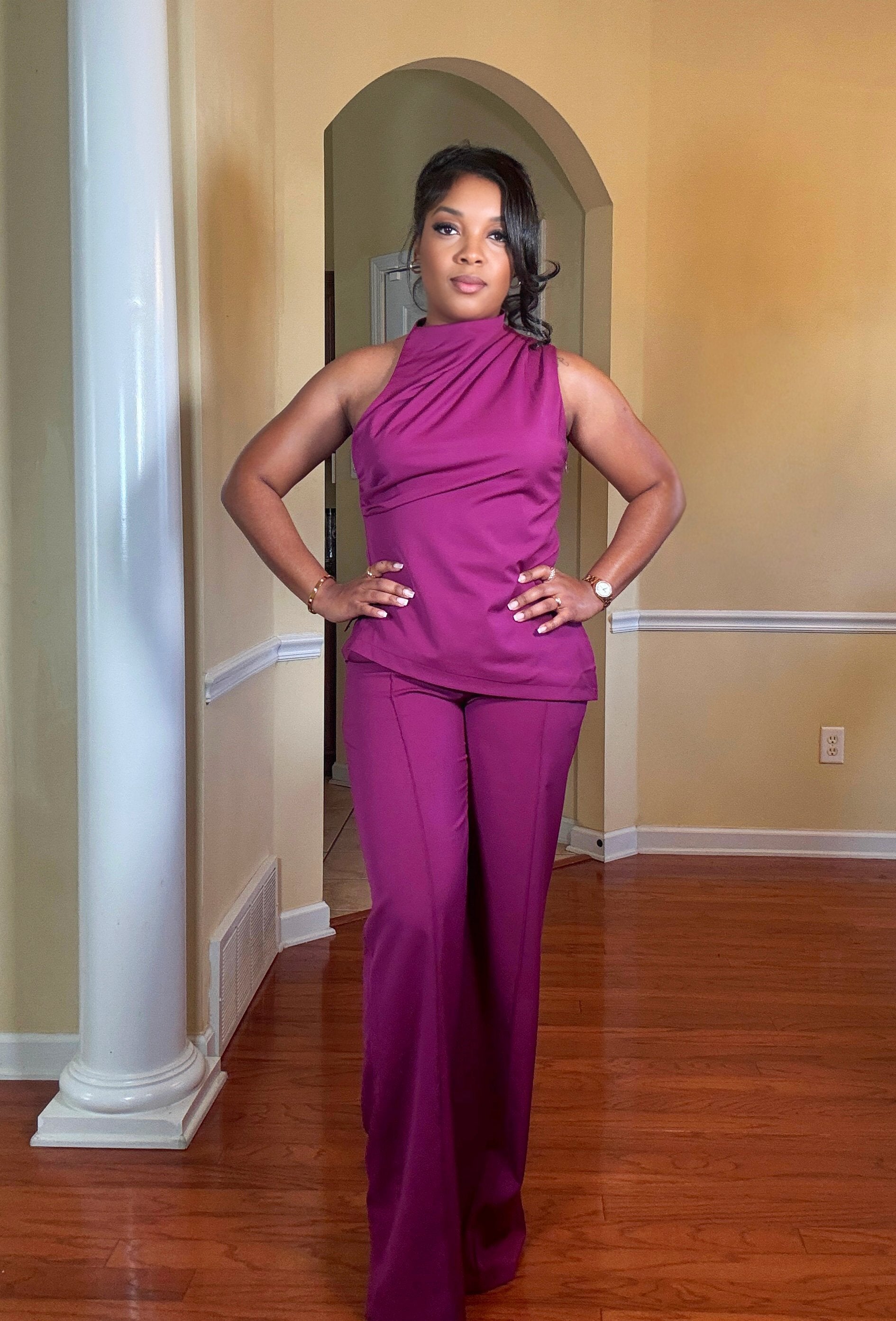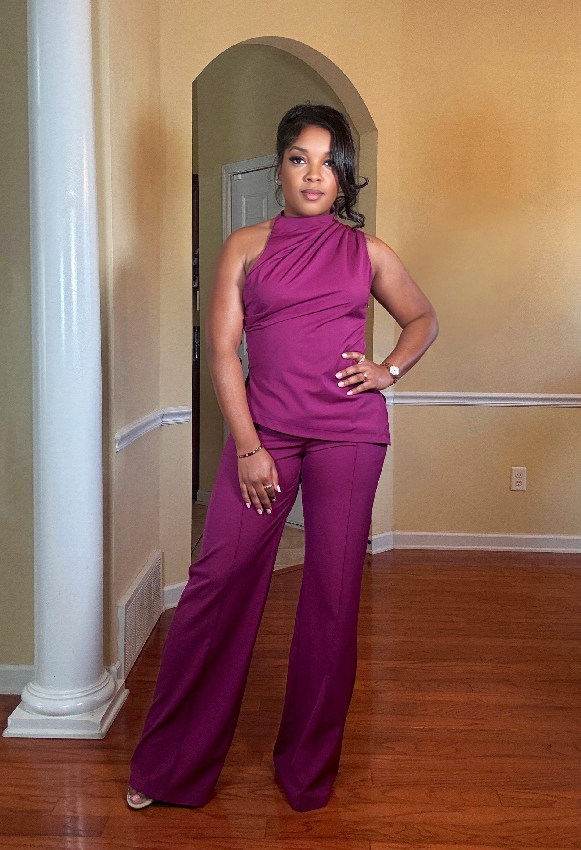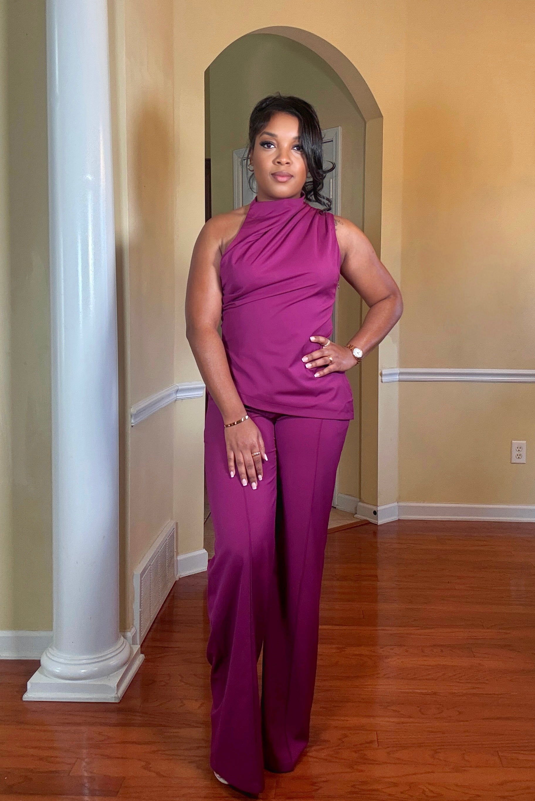 Ruched high neck shoulder sleeveless top with straight leg long pants. Matching set. Top and bottom. Tall girl friendly. Model is wearing a size Medium