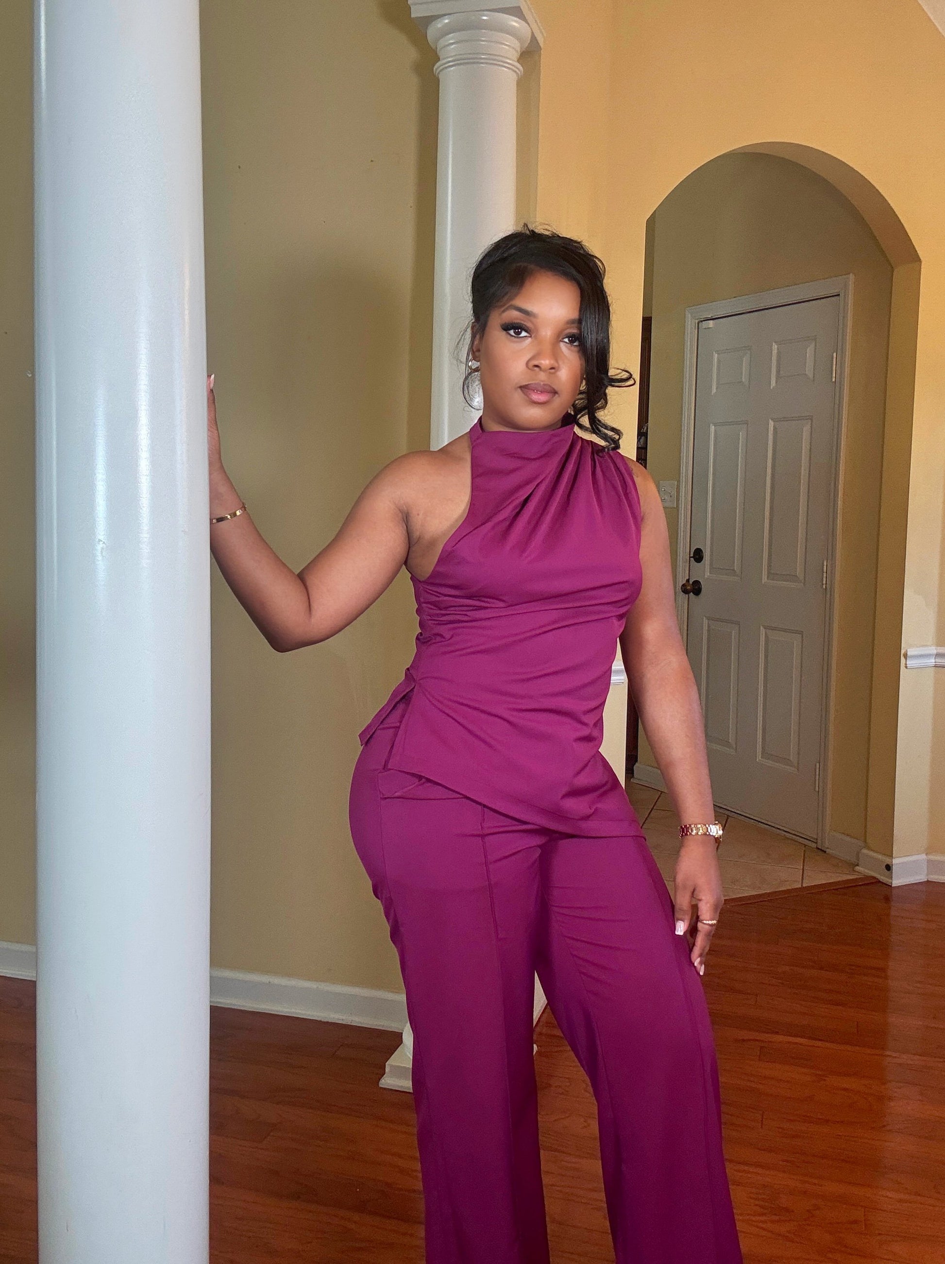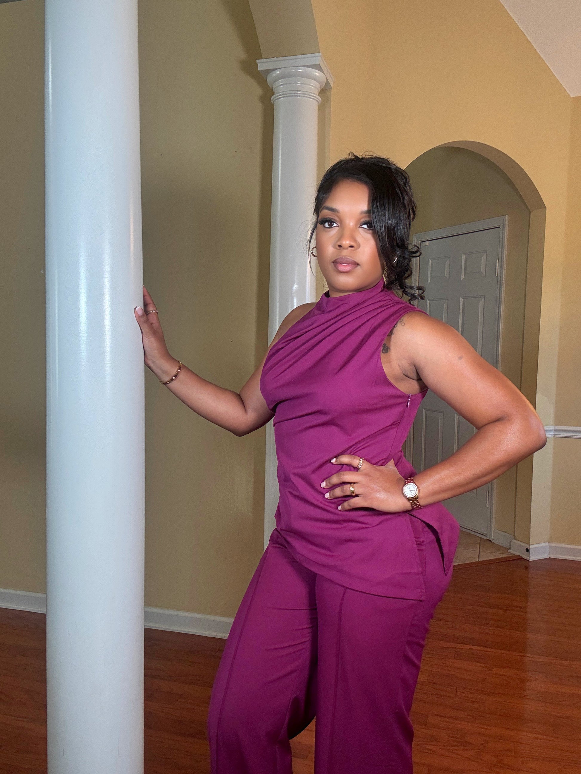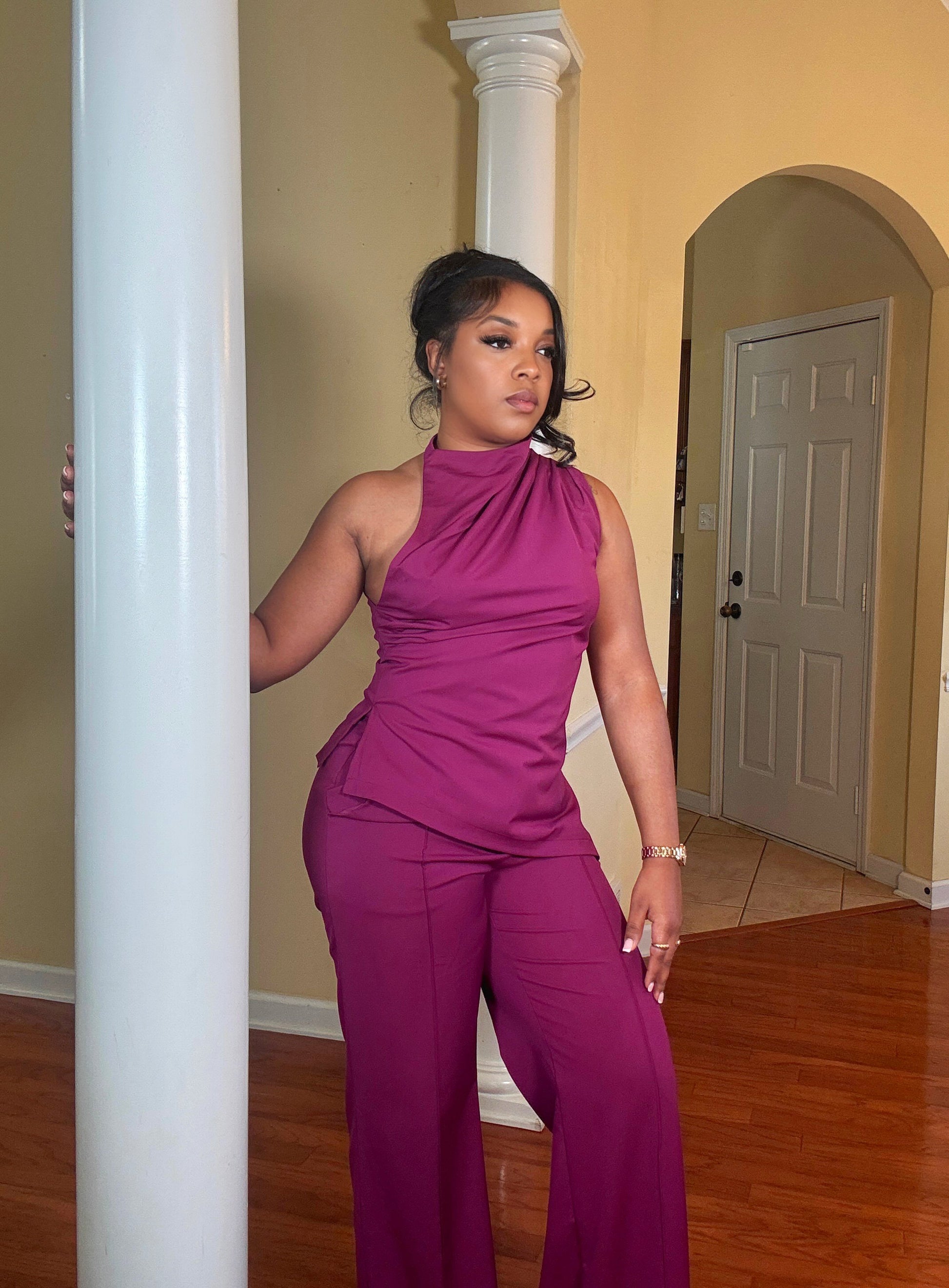 Ruched high neck shoulder sleeveless top with straight leg long pants. Matching set. Top and bottom. Tall girl friendly. Model is wearing a size Medium